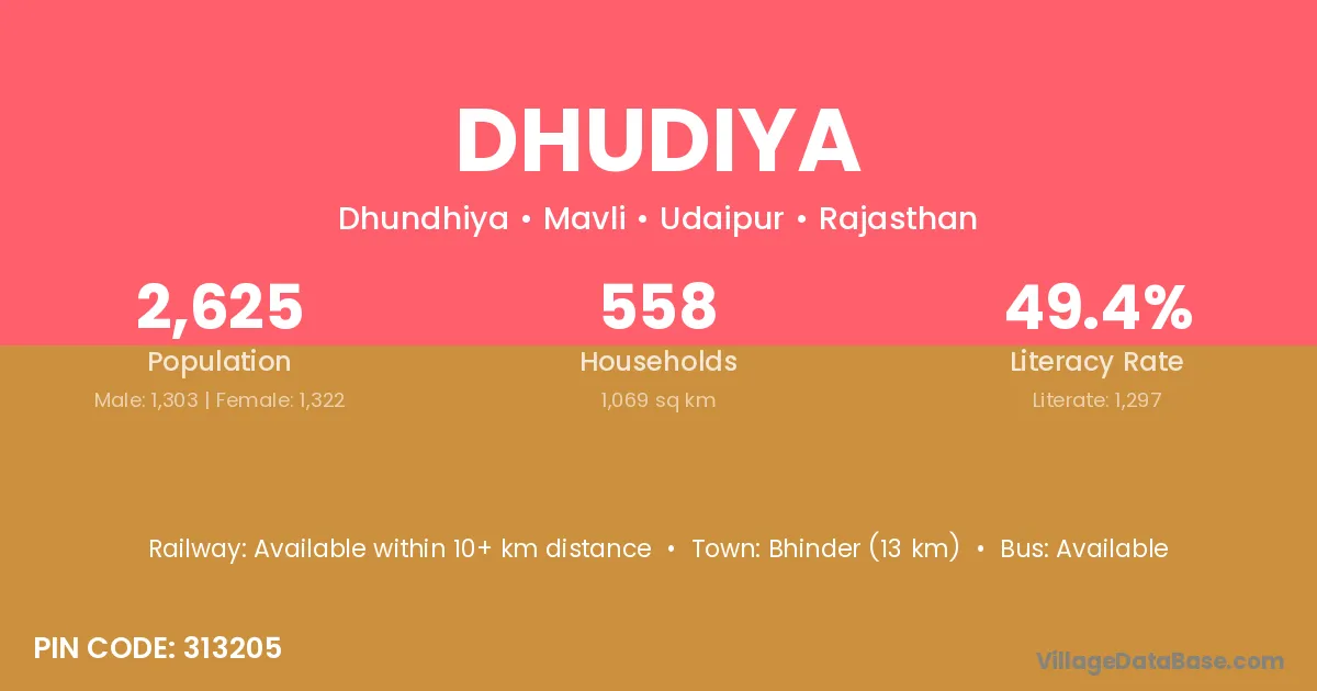 Bhinder (13 km) is the nearest town to Dhudiya village for major economic activities and is located approximately 13 km away.