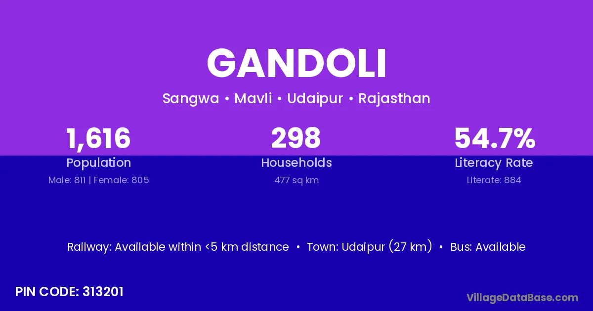Udaipur (27 km) is the nearest town to Gandoli village for major economic activities and is located approximately 27 km away.