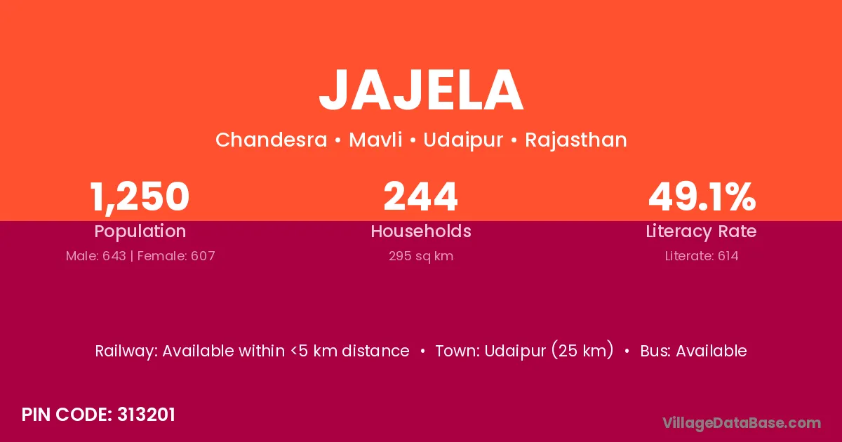 Jajela village has a total population of 1,250 people, of which 643 are males and 607 are females.