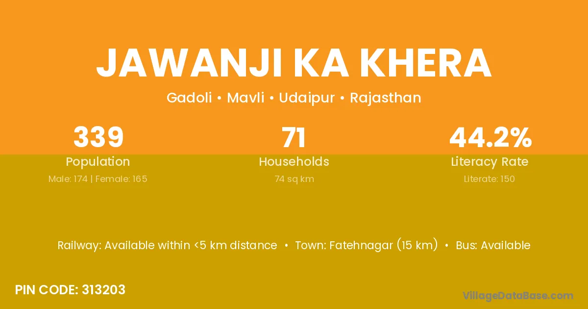 Fatehnagar (15 km) is the nearest town to Jawanji Ka Khera village for major economic activities and is located approximately 15 km away.