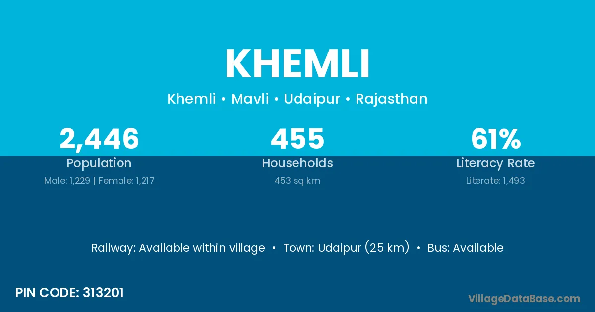Udaipur (25 km) is the nearest town to Khemli village for major economic activities and is located approximately 25 km away.