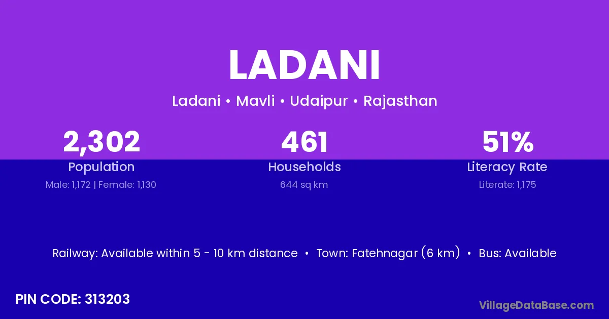 Fatehnagar (6 km) is the nearest town to Ladani village for major economic activities and is located approximately 6 km away.