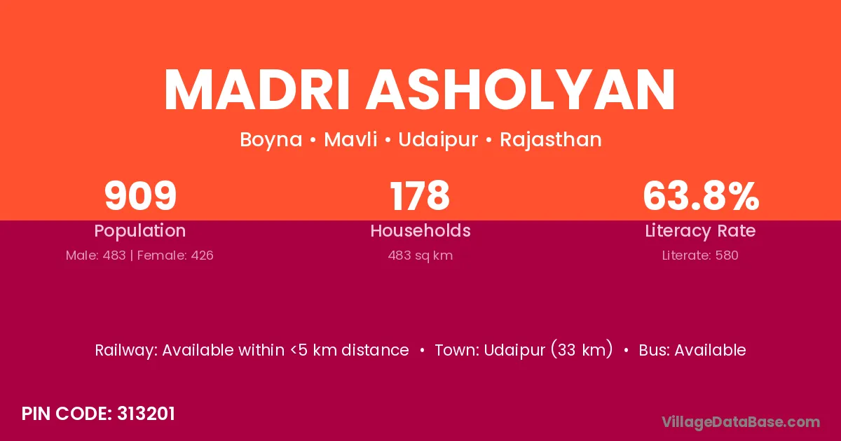 Udaipur (33 km) is the nearest town to Madri Asholyan village for major economic activities and is located approximately 33 km away.