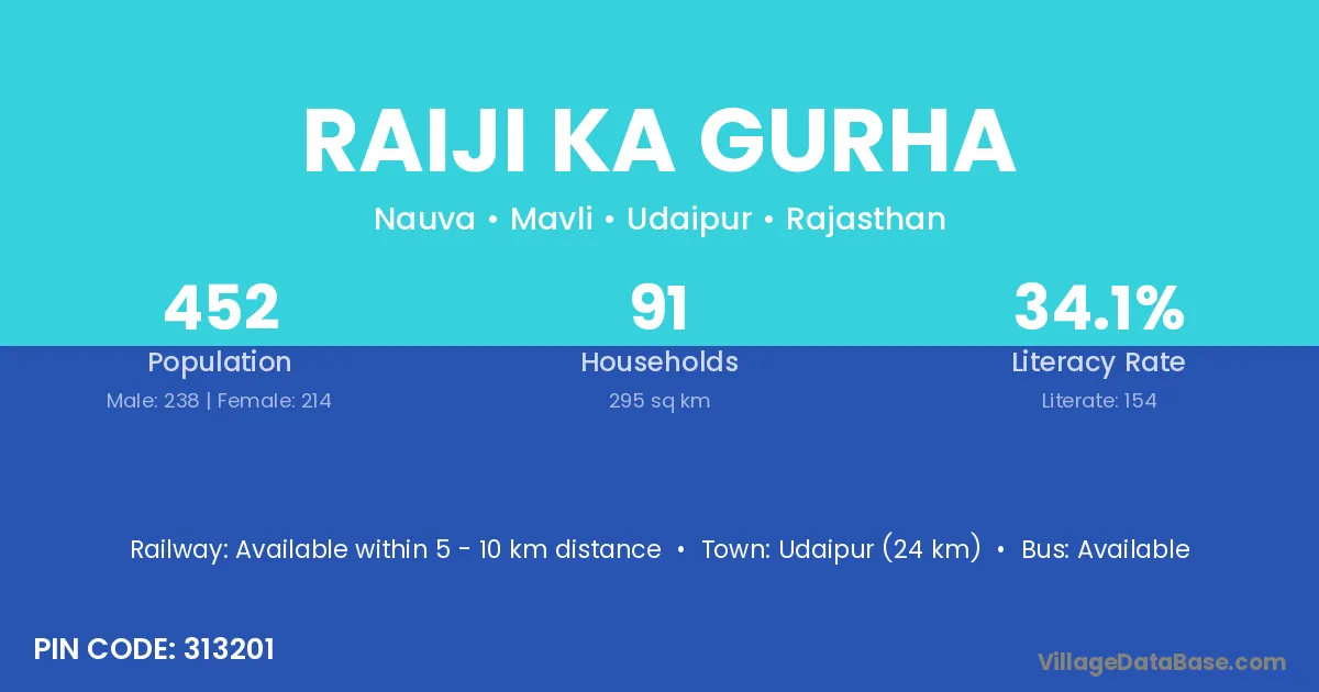 Raiji Ka Gurha village has a total population of 452 people, of which 238 are males and 214 are females.