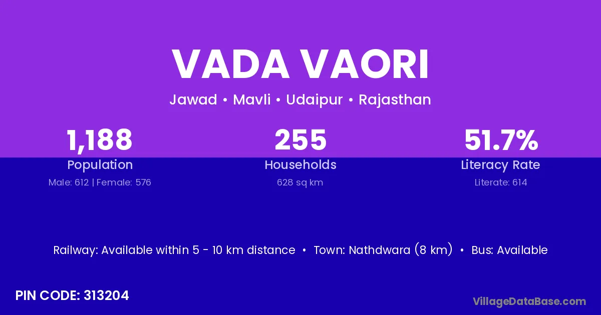 Nathdwara (8 km) is the nearest town to Vada Vaori village for major economic activities and is located approximately 8 km away.