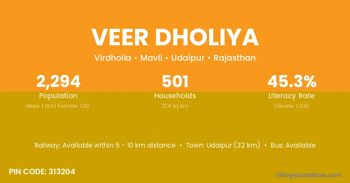Udaipur (32 km) is the nearest town to Veer Dholiya village for major economic activities and is located approximately 32 km away.