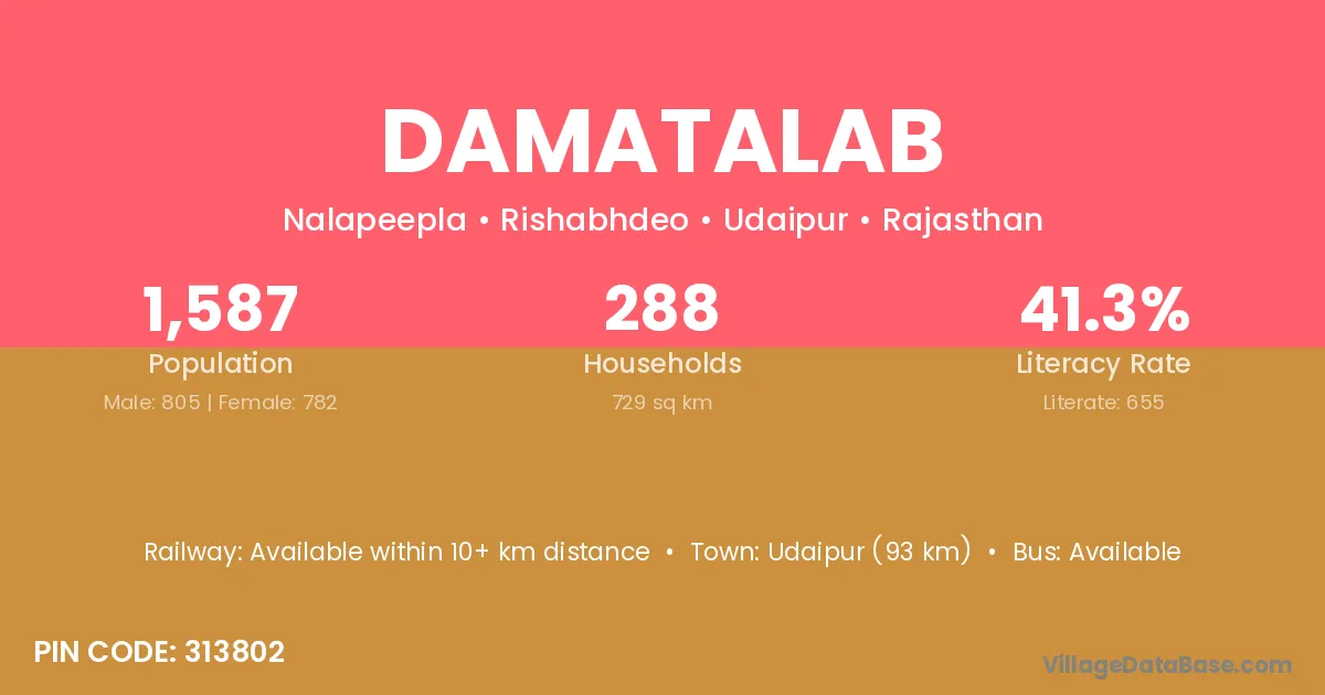 Udaipur (93 km) is the nearest town to Damatalab village for major economic activities and is located approximately 93 km away.