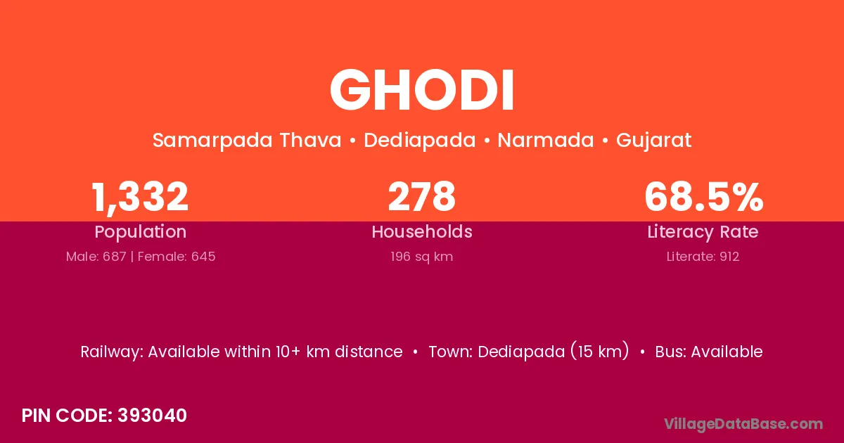 Ghodi village has a total population of 3,219 people, of which 1,622 are males and 1,597 are females.