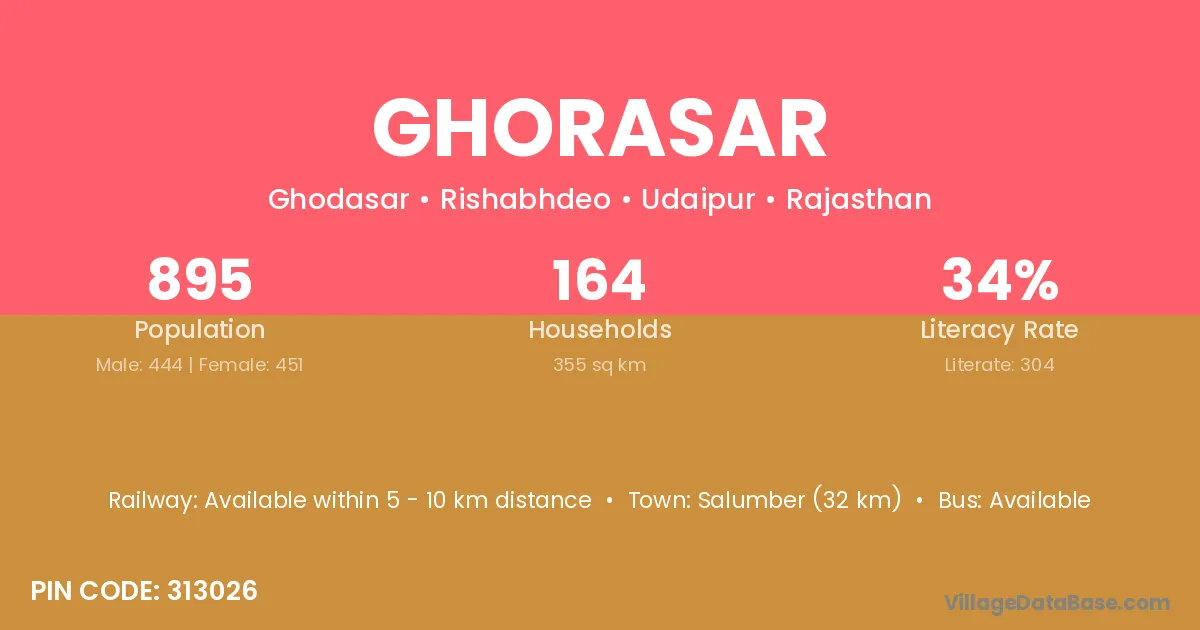 Salumber (32 km) is the nearest town to Ghorasar village for major economic activities and is located approximately 32 km away.