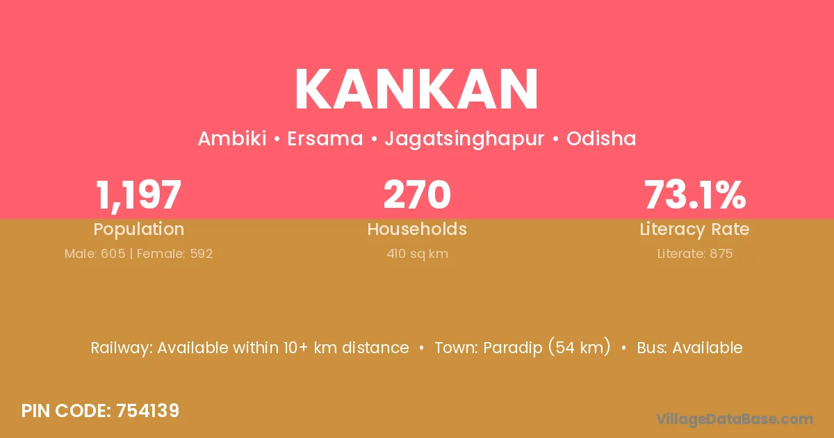 Kankan village has a total population of 1,199 people, of which 610 are males and 589 are females.