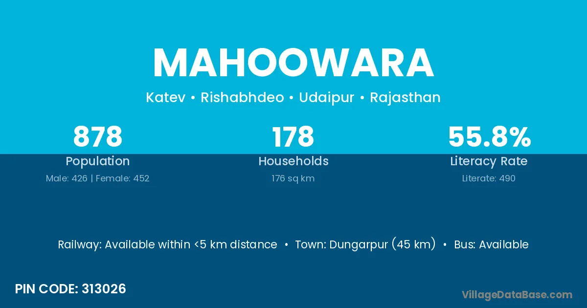 Dungarpur (45 km) is the nearest town to Mahoowara village for major economic activities and is located approximately 45 km away.