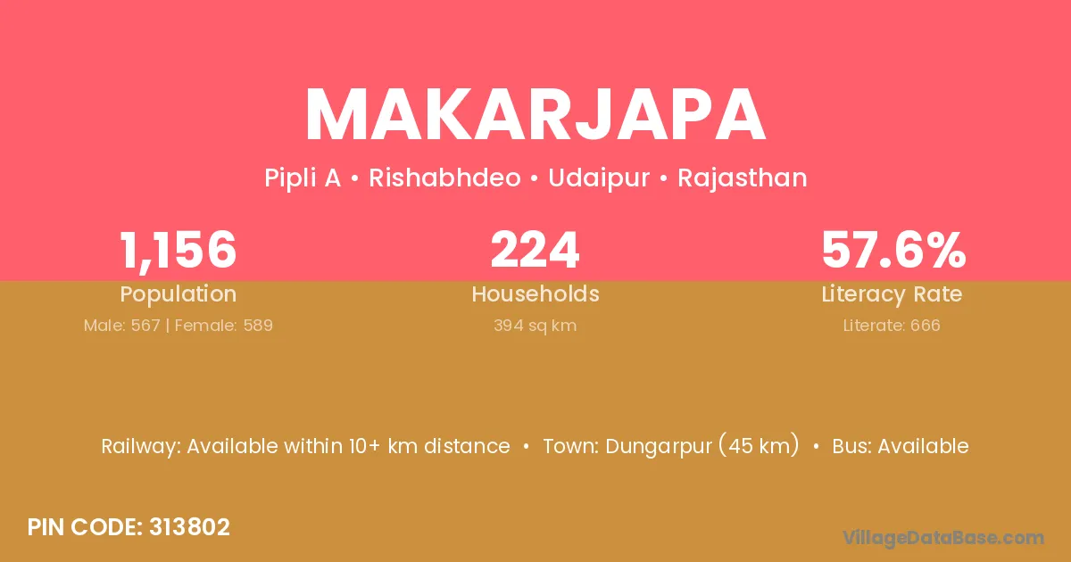 Dungarpur (45 km) is the nearest town to Makarjapa village for major economic activities and is located approximately 45 km away.