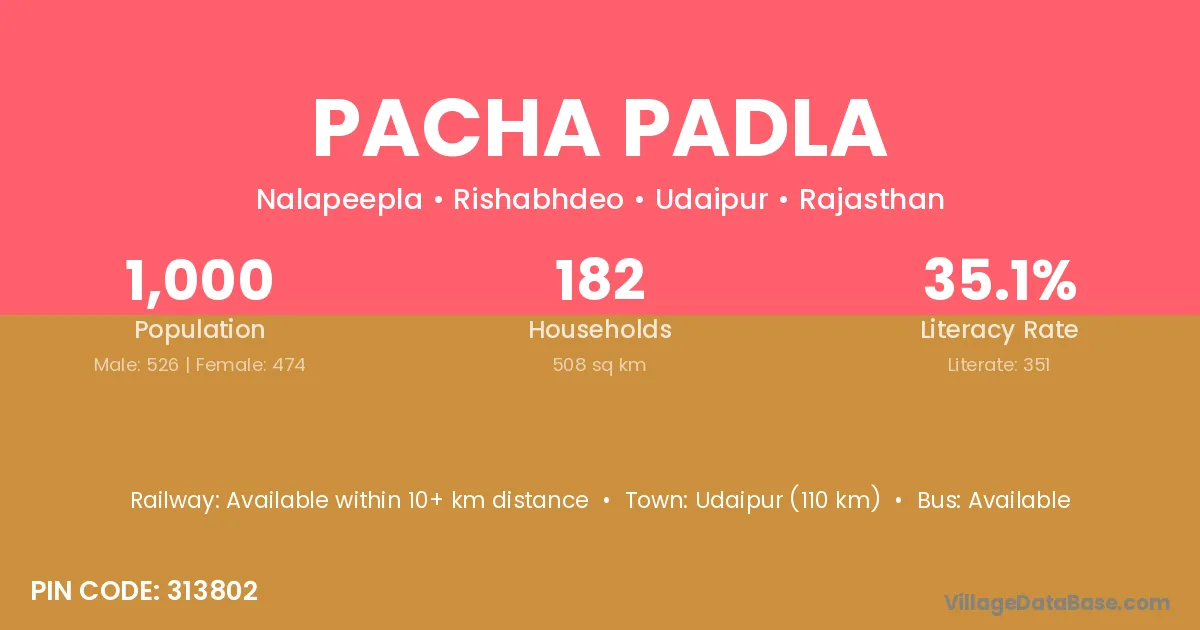 Udaipur (110 km) is the nearest town to Pacha Padla village for major economic activities and is located approximately 110 km away.