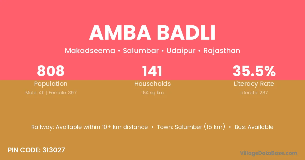 Salumber (15 km) is the nearest town to Amba Badli village for major economic activities and is located approximately 15 km away.