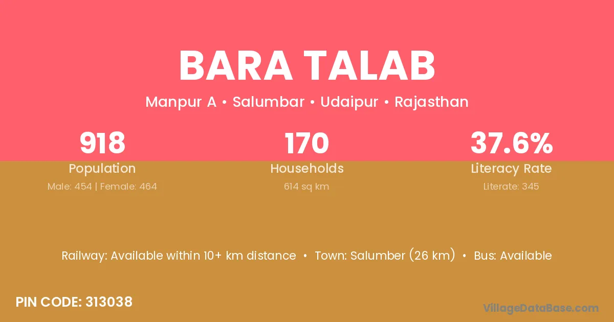 Salumber (26 km) is the nearest town to Bara Talab village for major economic activities and is located approximately 26 km away.