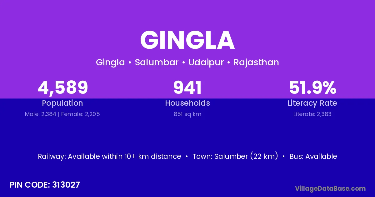 Salumber (22 km) is the nearest town to Gingla village for major economic activities and is located approximately 22 km away.