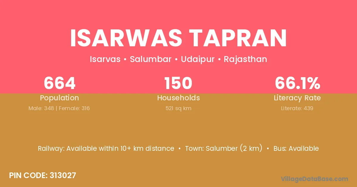 Salumber (2 km) is the nearest town to Isarwas Tapran village for major economic activities and is located approximately 2 km away.