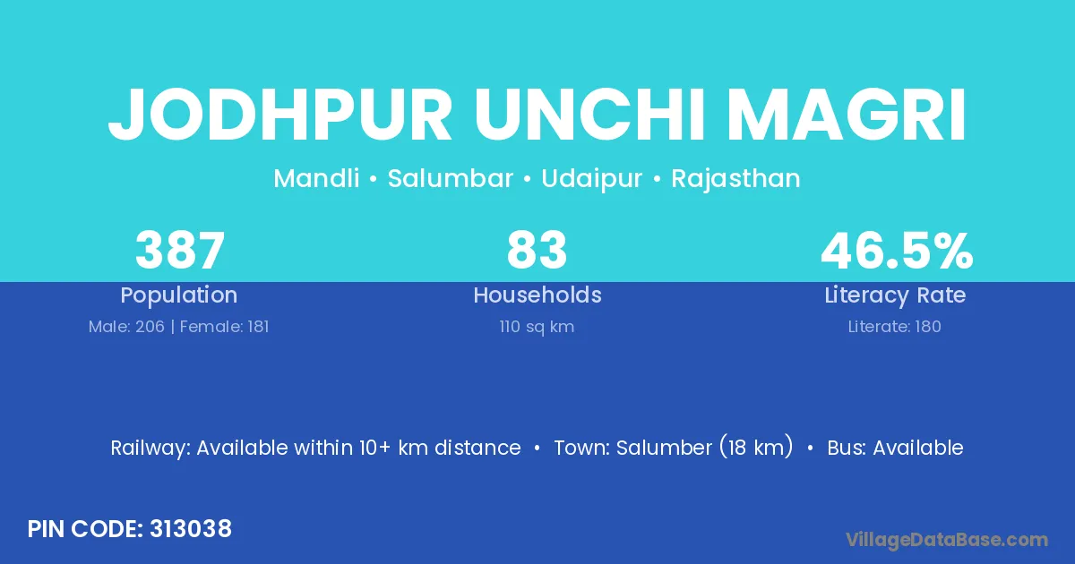 Salumber (18 km) is the nearest town to Jodhpur Unchi Magri village for major economic activities and is located approximately 18 km away.