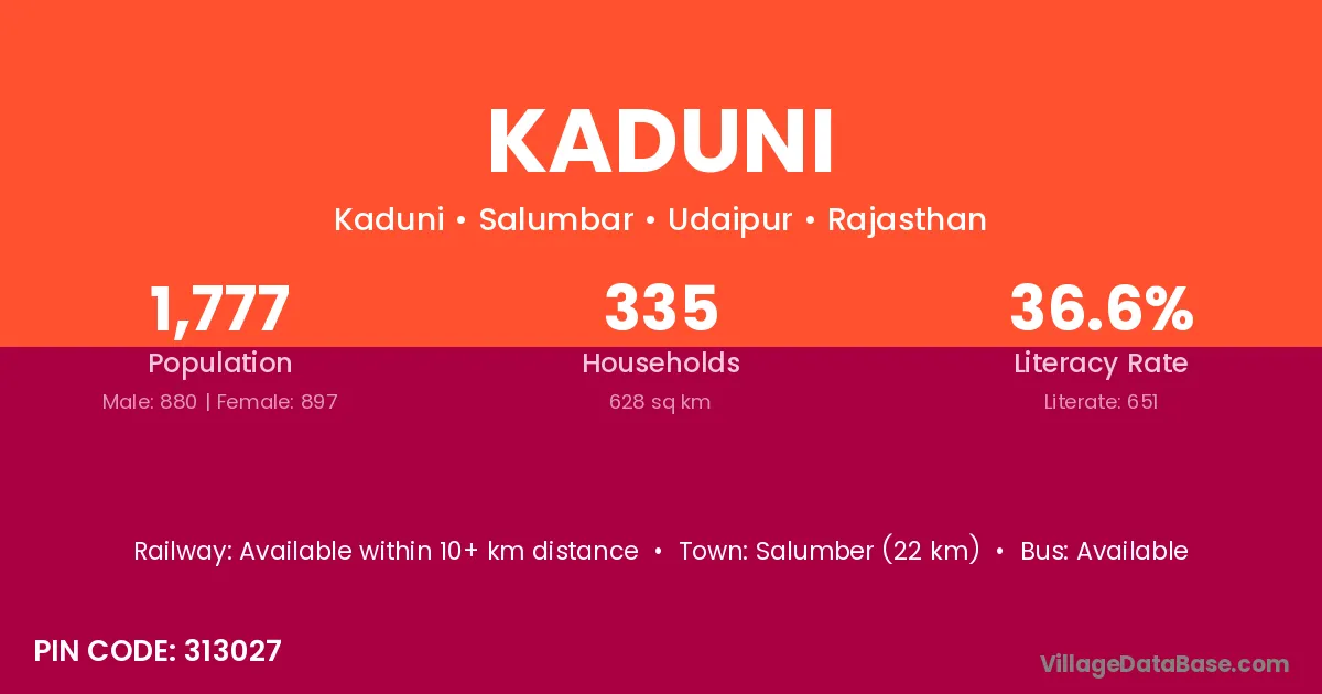 Salumber (22 km) is the nearest town to Kaduni village for major economic activities and is located approximately 22 km away.