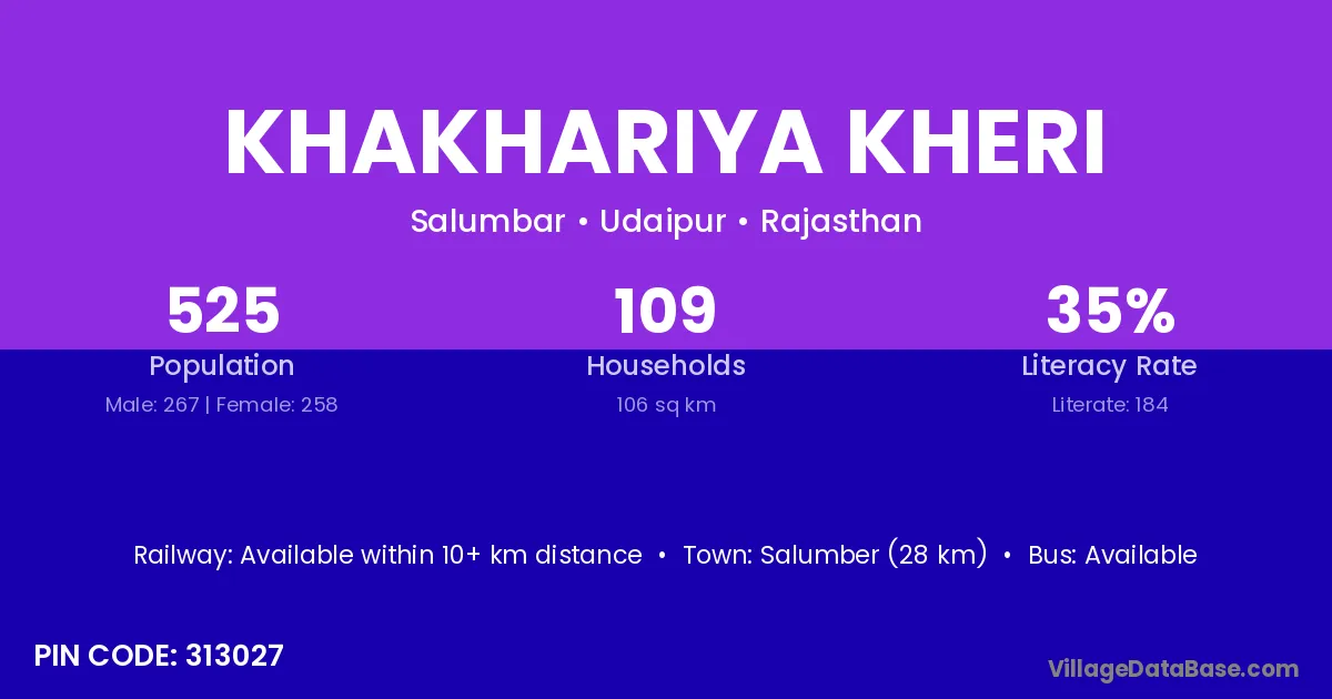 Salumber (28 km) is the nearest town to Khakhariya Kheri village for major economic activities and is located approximately 28 km away.