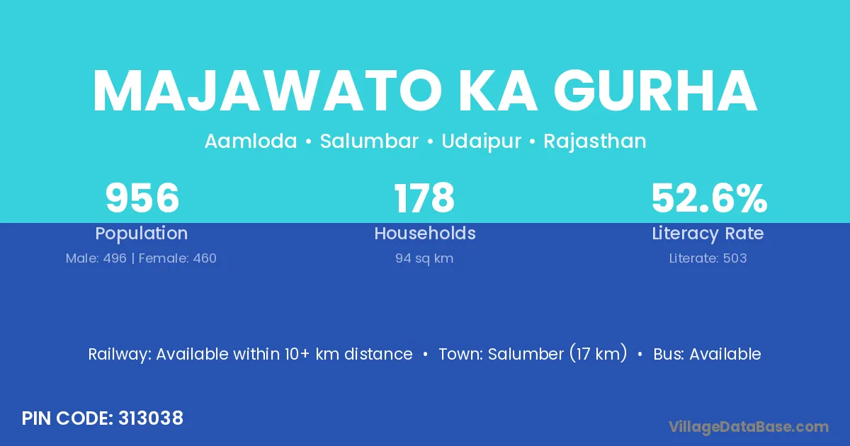Salumber (17 km) is the nearest town to Majawato Ka Gurha village for major economic activities and is located approximately 17 km away.