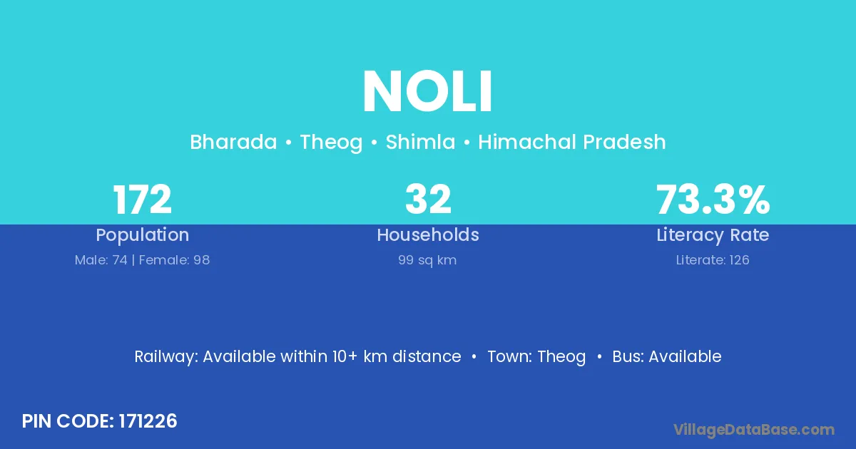 The literacy rate of Noli village is 53.69%. Male literacy stands at 63.84% and female literacy at 42.46%.
