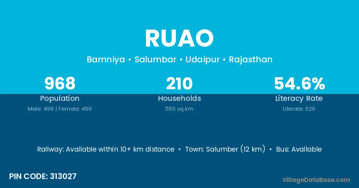 Salumber (12 km) is the nearest town to Ruao village for major economic activities and is located approximately 12 km away.