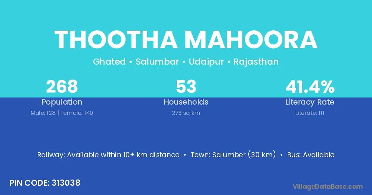 Thootha Mahoora village has a total population of 268 people, of which 128 are males and 140 are females.