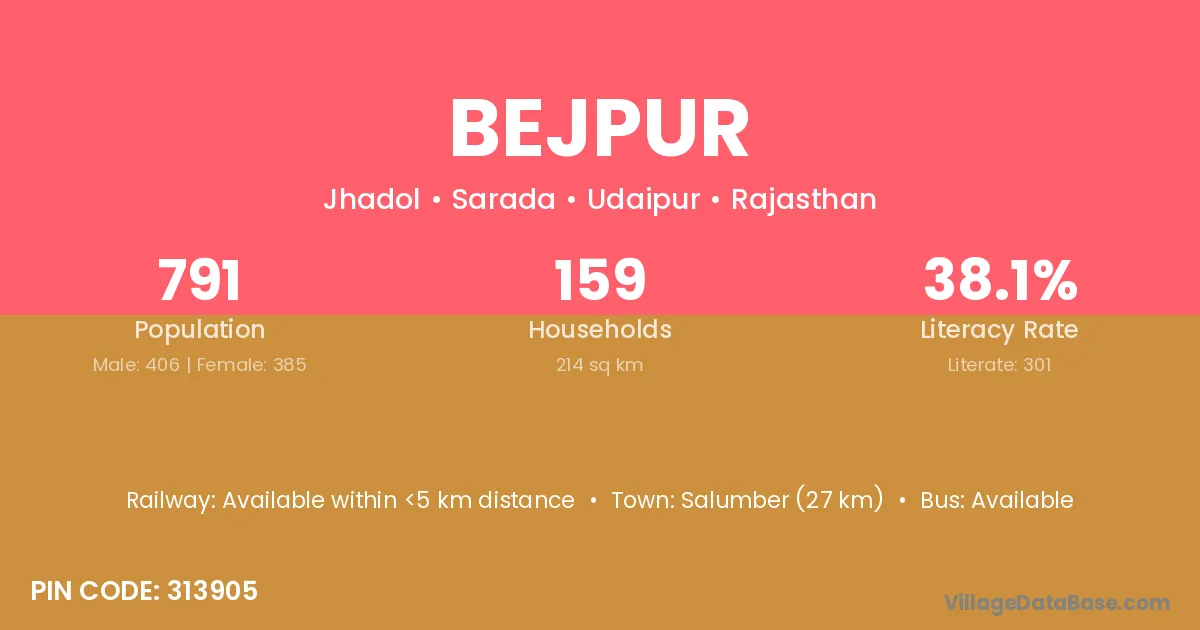 Salumber (27 km) is the nearest town to Bejpur village for major economic activities and is located approximately 27 km away.