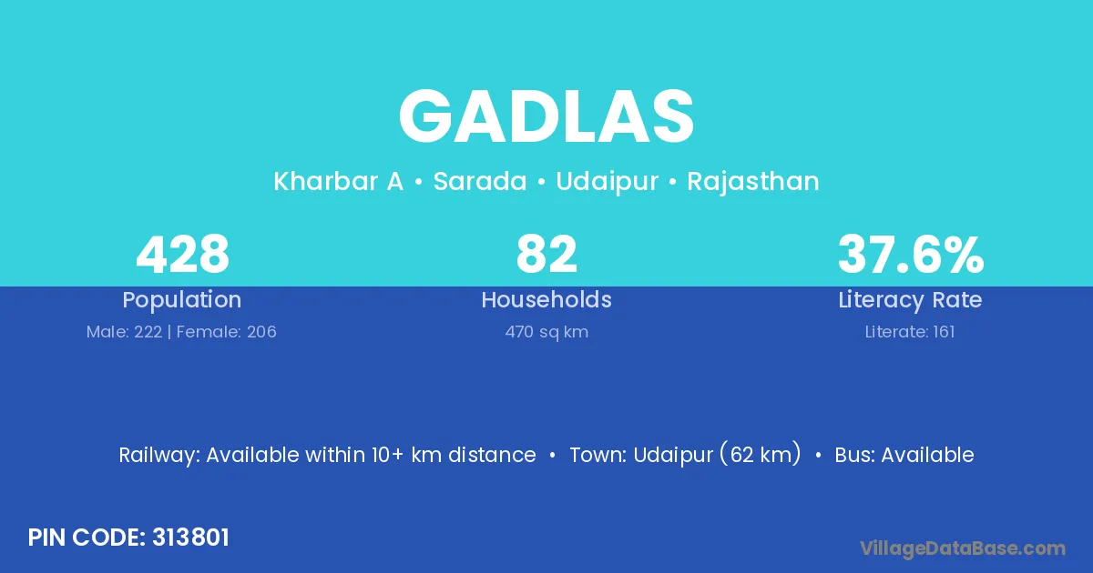 Udaipur (62 km) is the nearest town to Gadlas village for major economic activities and is located approximately 62 km away.