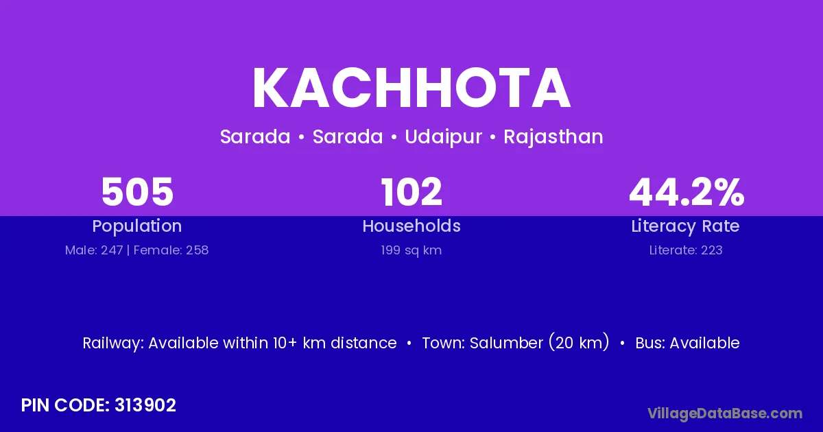 Salumber (20 km) is the nearest town to Kachhota village for major economic activities and is located approximately 20 km away.