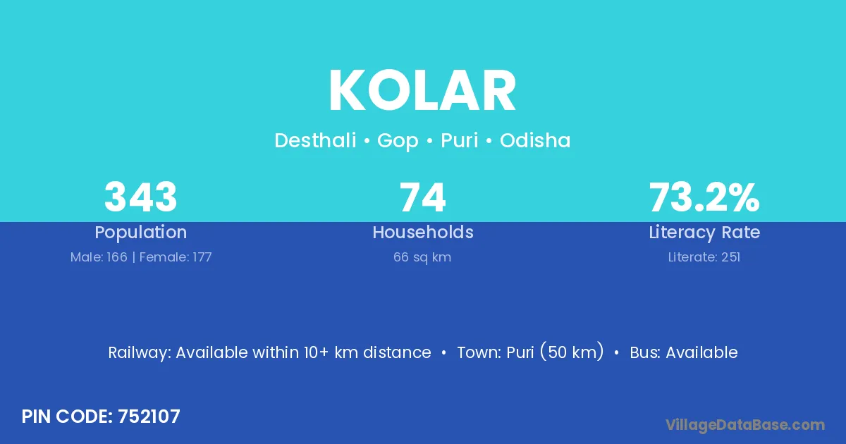 The literacy rate of Kolar village is 53.32%. Male literacy stands at 68.87% and female literacy at 34.94%.