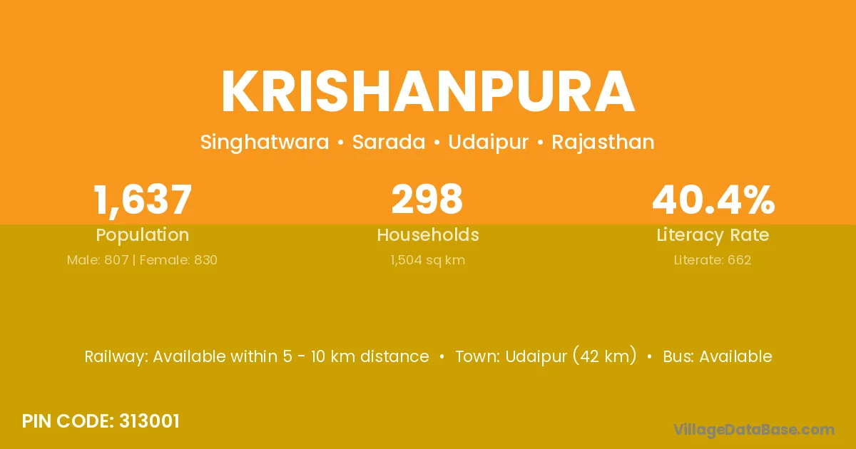 Udaipur (42 km) is the nearest town to Krishanpura village for major economic activities and is located approximately 42 km away.