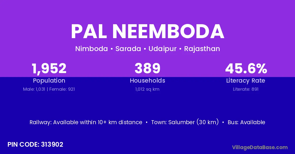 Salumber (30 km) is the nearest town to Pal Neemboda village for major economic activities and is located approximately 30 km away.