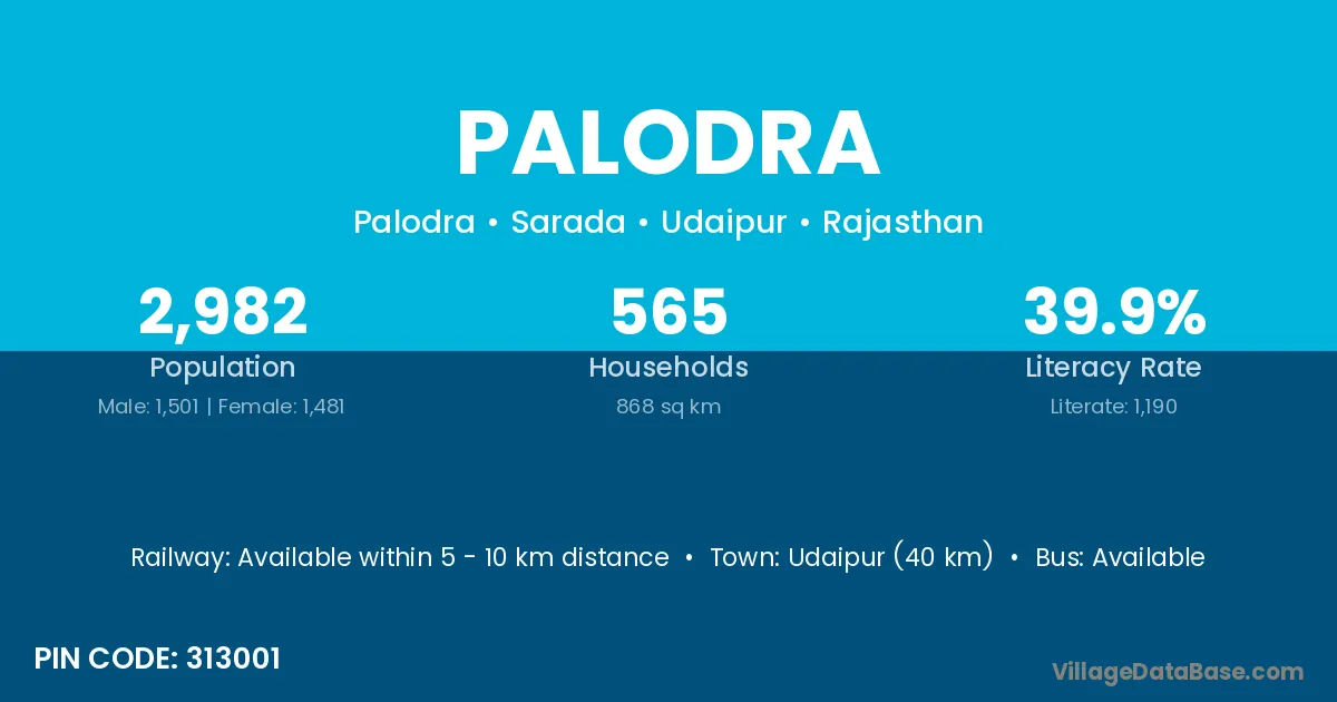 Udaipur (40 km) is the nearest town to Palodra village for major economic activities and is located approximately 40 km away.