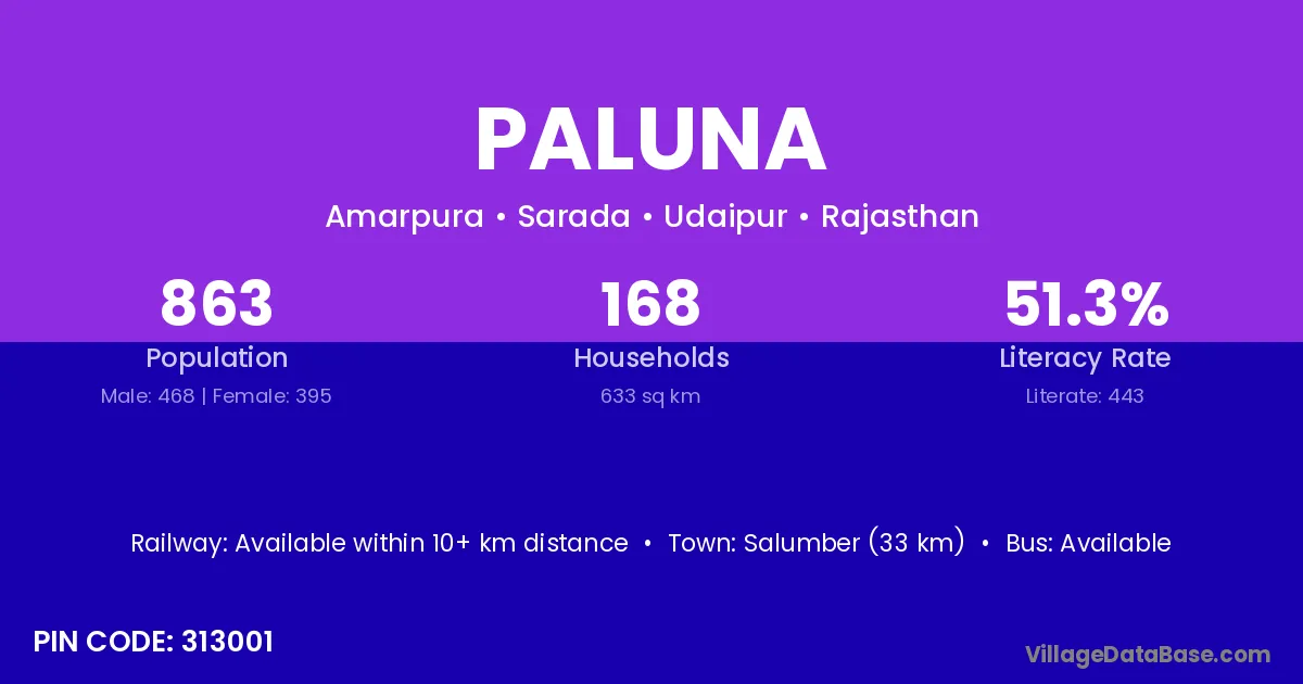 Salumber (33 km) is the nearest town to Paluna village for major economic activities and is located approximately 33 km away.