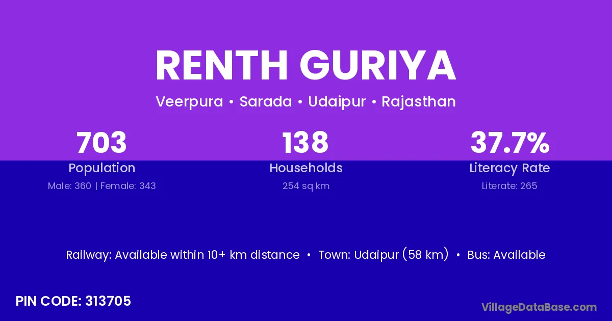 Udaipur (58 km) is the nearest town to Renth Guriya village for major economic activities and is located approximately 58 km away.