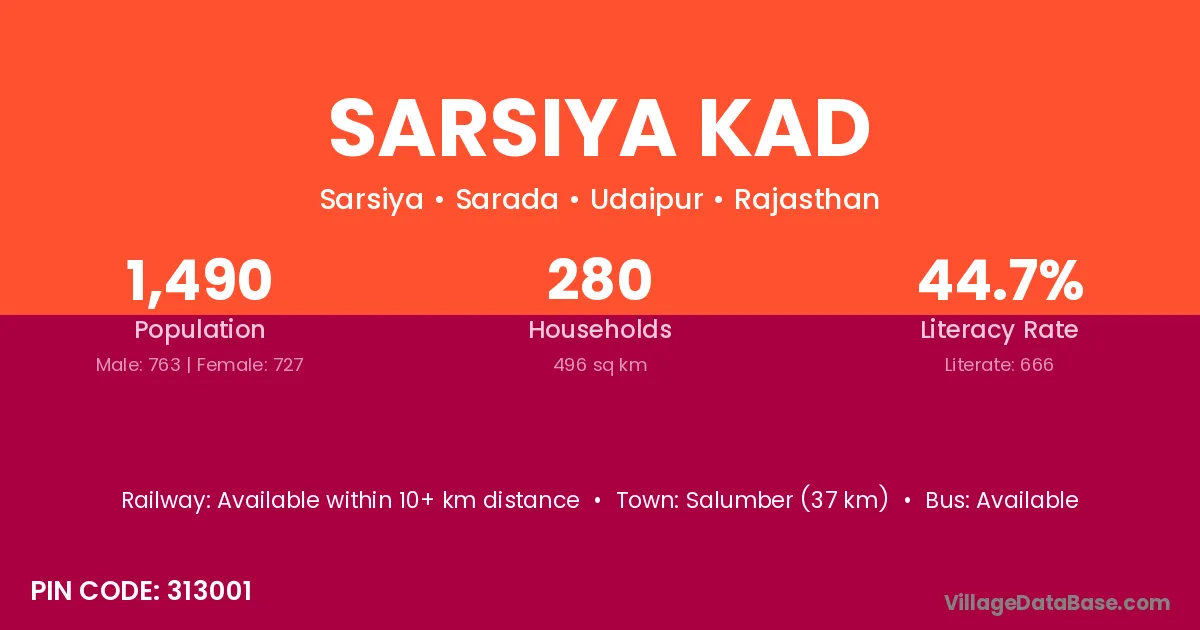 Salumber (37 km) is the nearest town to Sarsiya Kad village for major economic activities and is located approximately 37 km away.