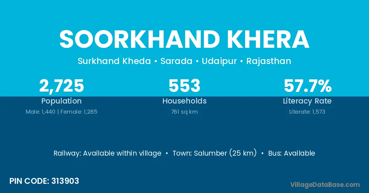Salumber (25 km) is the nearest town to Soorkhand Khera village for major economic activities and is located approximately 25 km away.