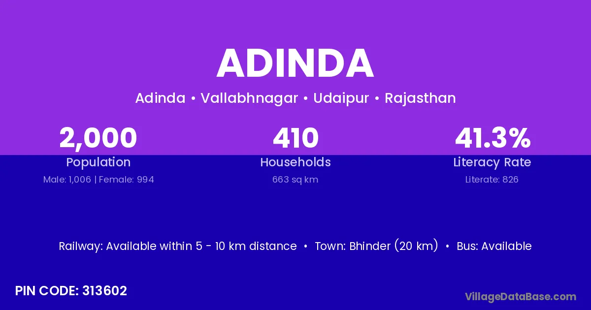 Bhinder (20 km) is the nearest town to Adinda village for major economic activities and is located approximately 20 km away.