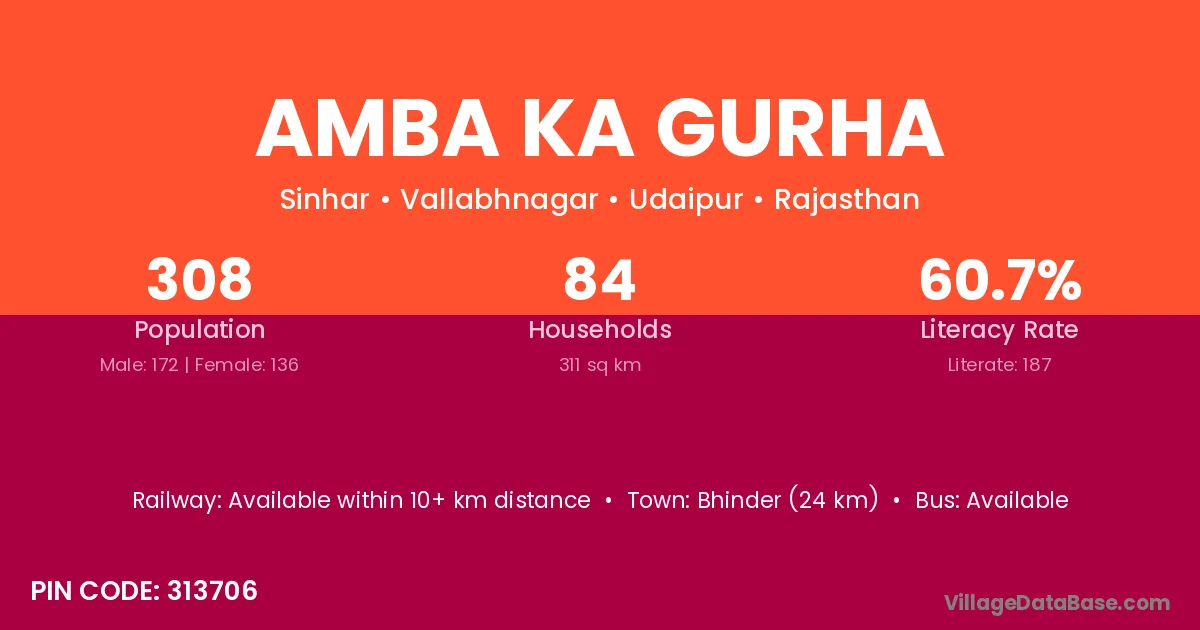Amba Ka Gurha village has a total population of 308 people, of which 172 are males and 136 are females.