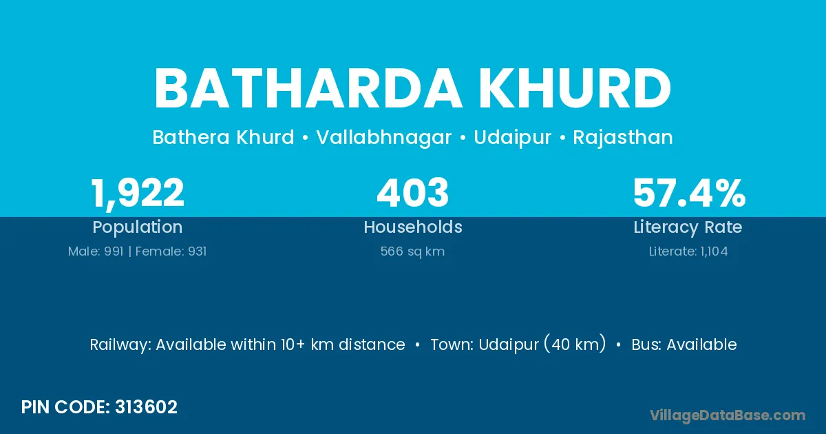 Udaipur (40 km) is the nearest town to Batharda Khurd village for major economic activities and is located approximately 40 km away.