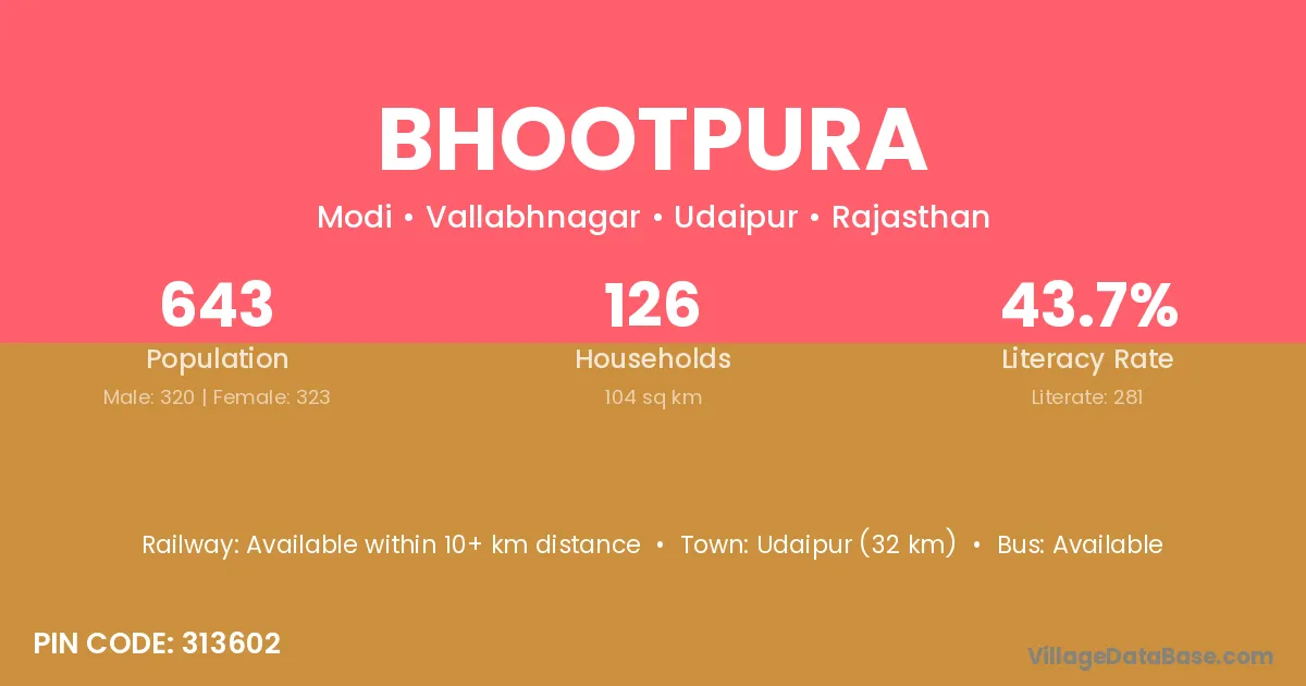 Udaipur (32 km) is the nearest town to Bhootpura village for major economic activities and is located approximately 32 km away.