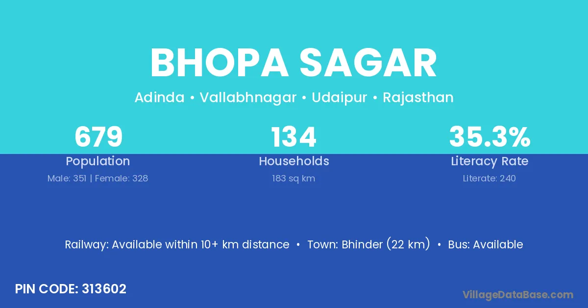 Bhopa Sagar village has a total population of 679 people, of which 351 are males and 328 are females.