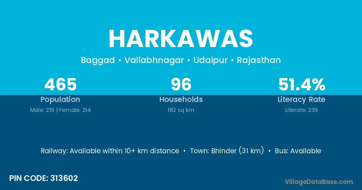 Harkawas village has a total population of 465 people, of which 251 are males and 214 are females.