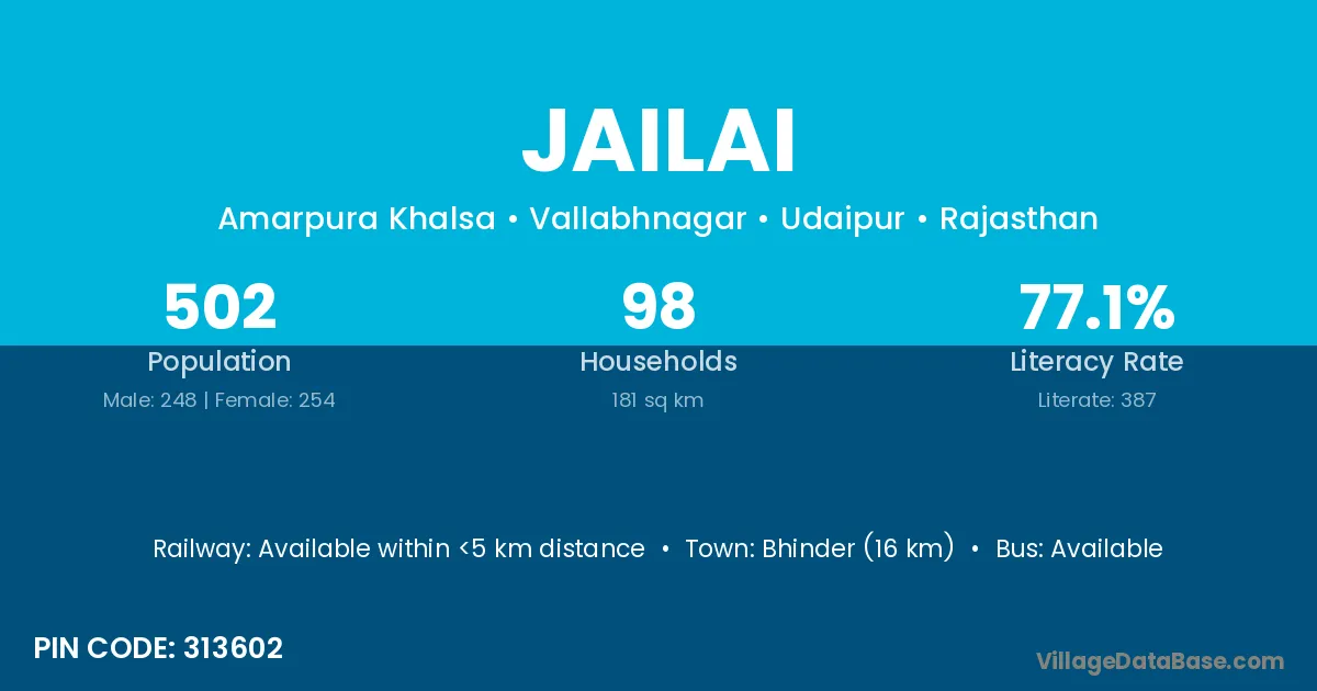 Bhinder (16 km) is the nearest town to Jailai village for major economic activities and is located approximately 16 km away.