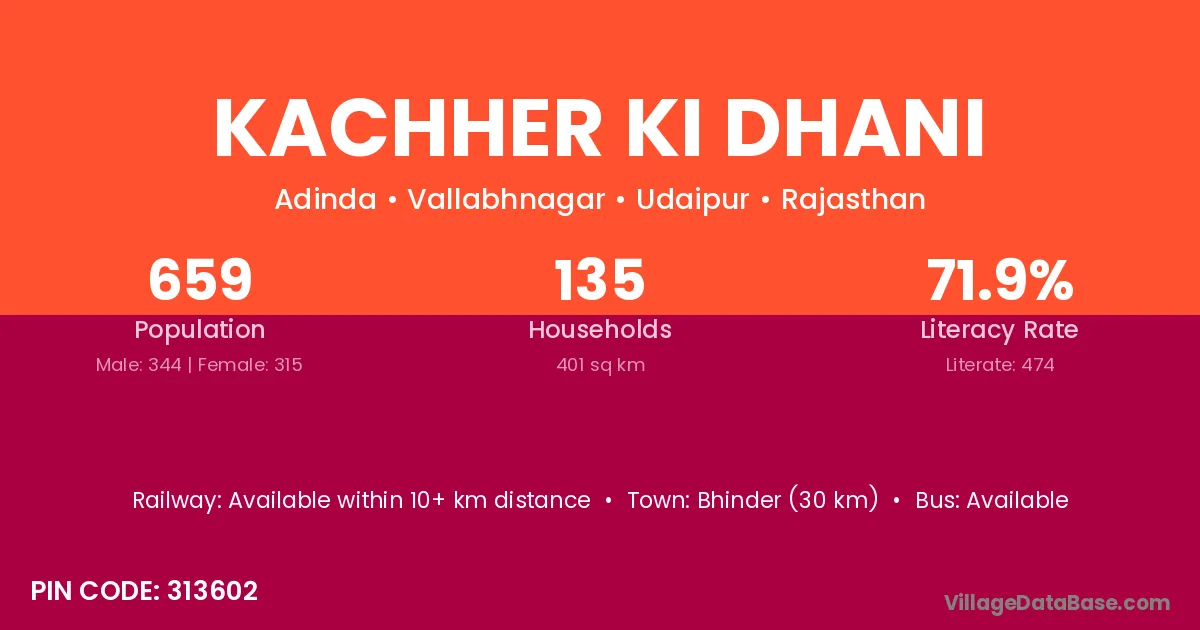 Kachher Ki Dhani village has a total population of 659 people, of which 344 are males and 315 are females.