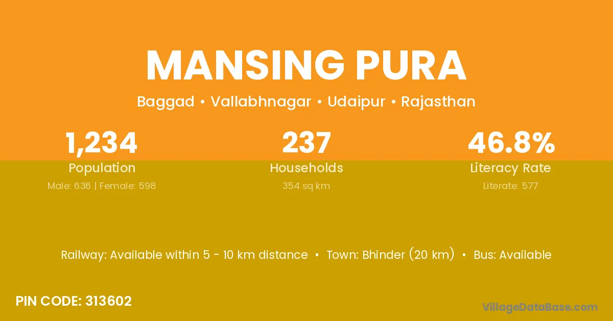 Mansing Pura village has a total population of 1,234 people, of which 636 are males and 598 are females.