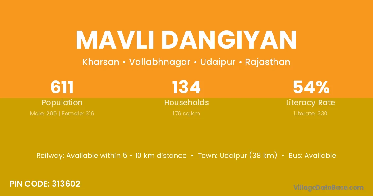 Mavli Dangiyan village has a total population of 611 people, of which 295 are males and 316 are females.