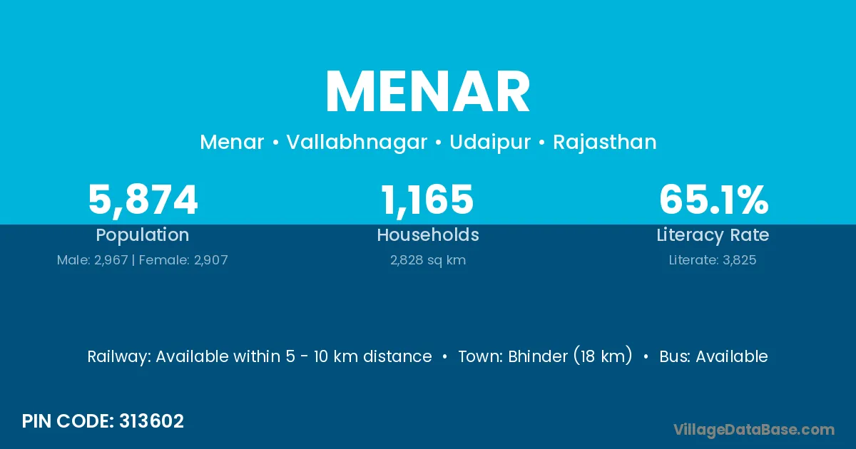 Bhinder (18 km) is the nearest town to Menar village for major economic activities and is located approximately 18 km away.